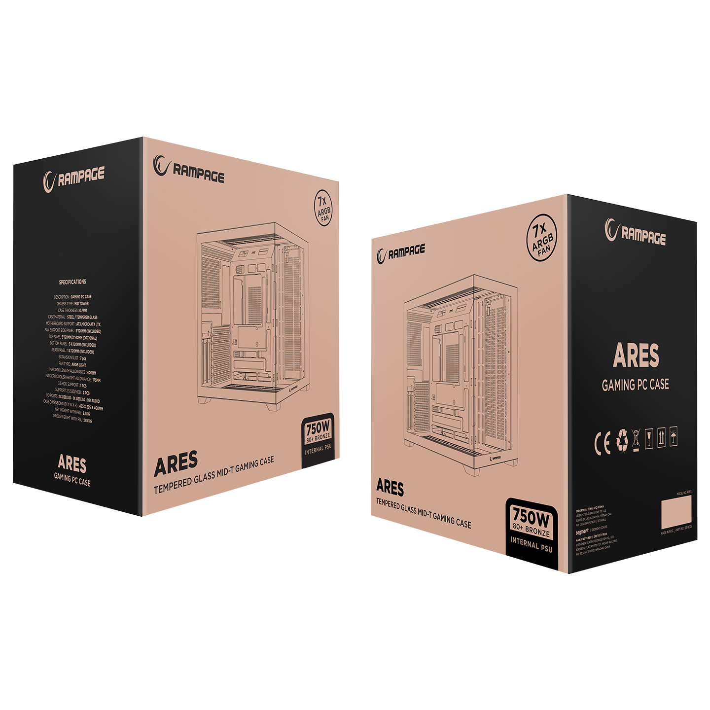 Rampage ARES Temperli Camlı 750W 80 Plus Bronze Siyah 7*12cm ARGB Fan ATX Mid-T Gaming Oyuncu Kasası