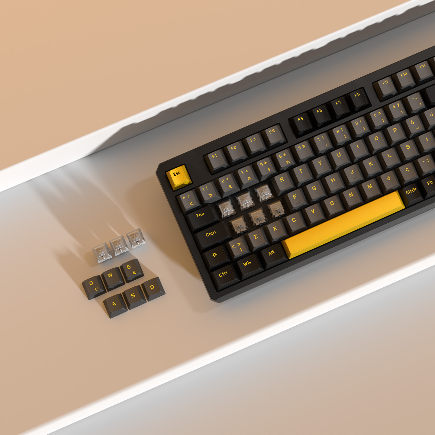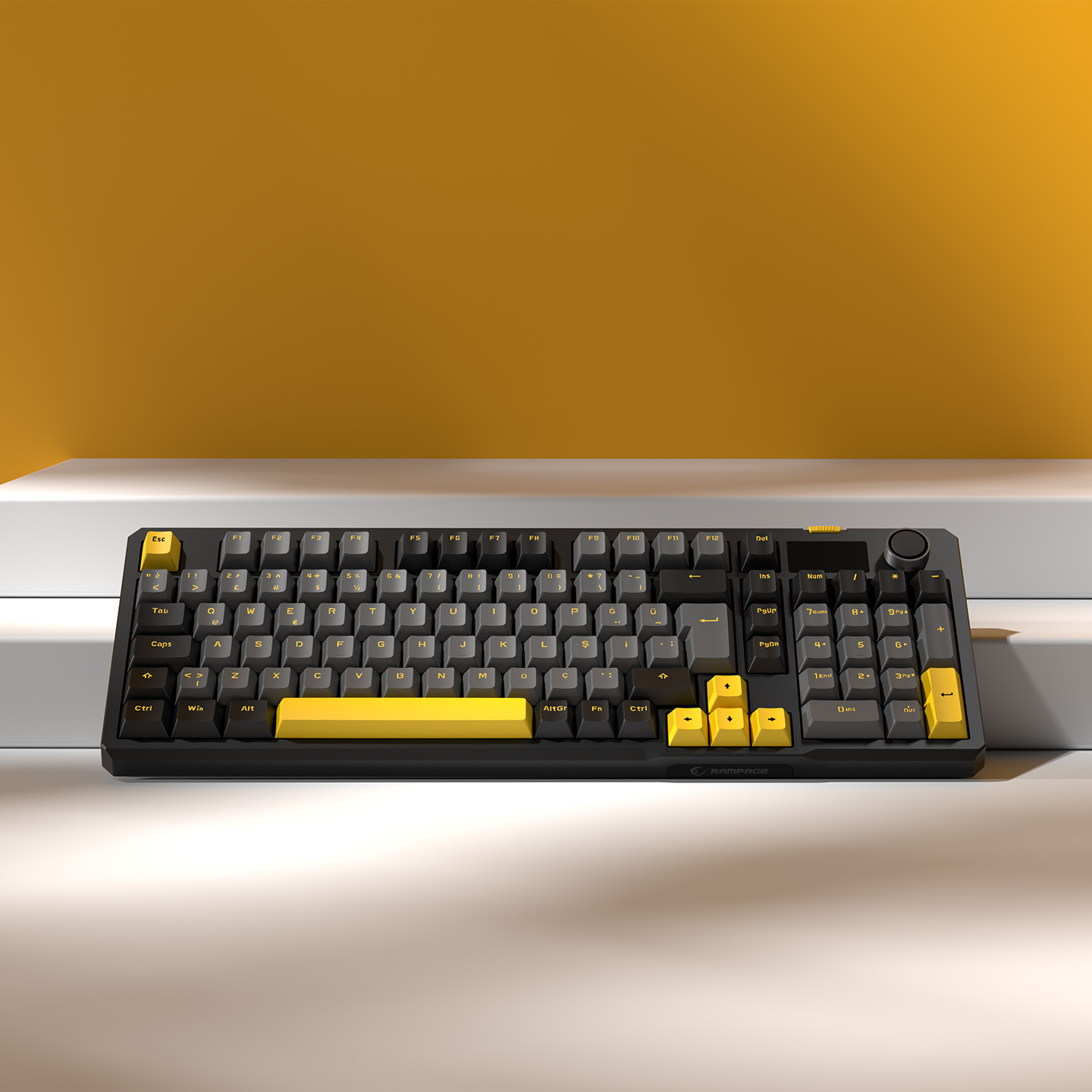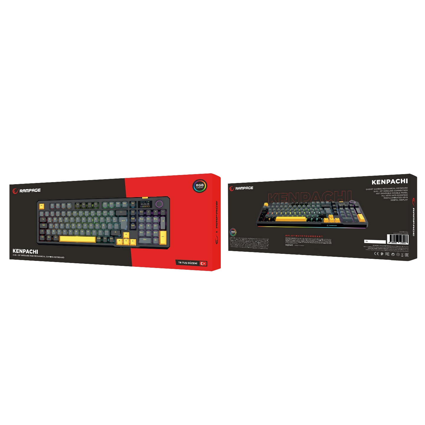 Rampage Kenpachi Ekranlı Gri/Siyah/Sarı 2.4G + BT Wireless RGB Hot Swap Gasket Oil Switch Türkçe Q PBT Keycaps Mekanik K