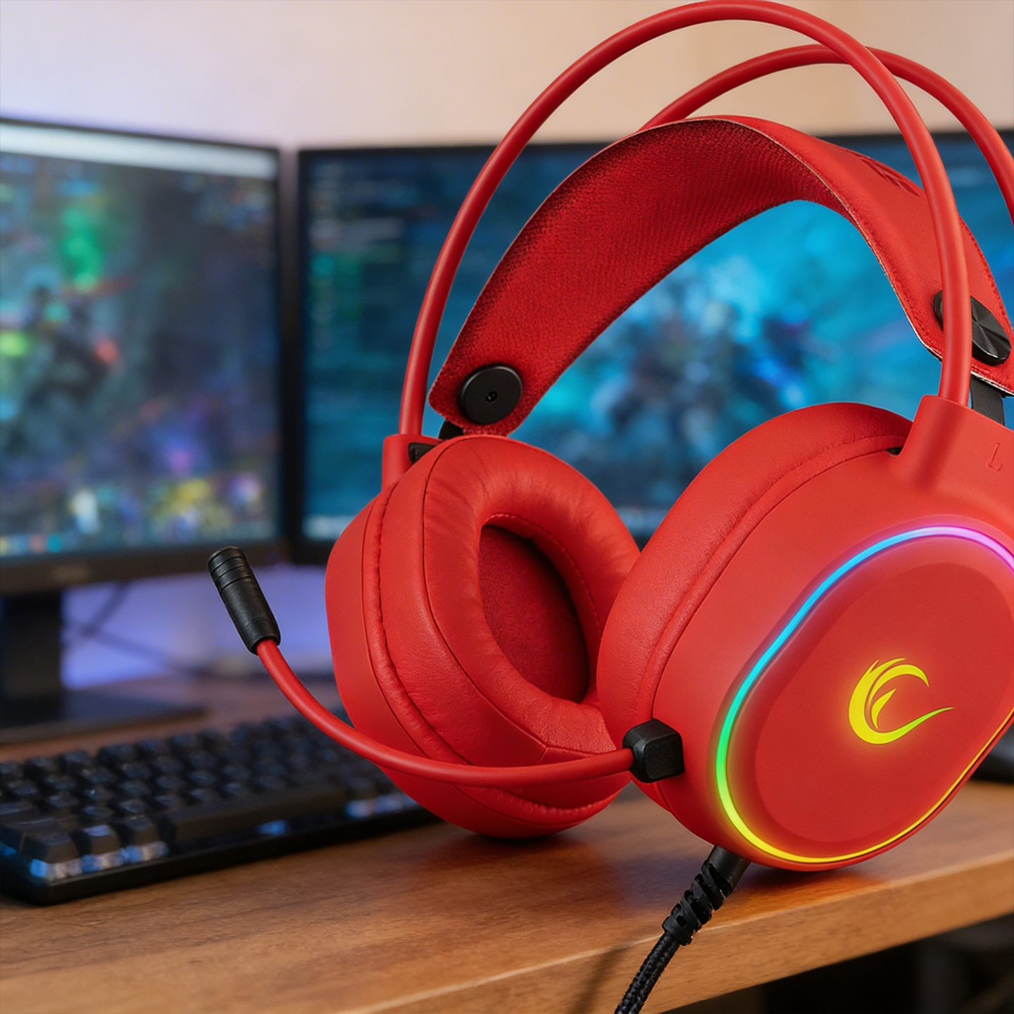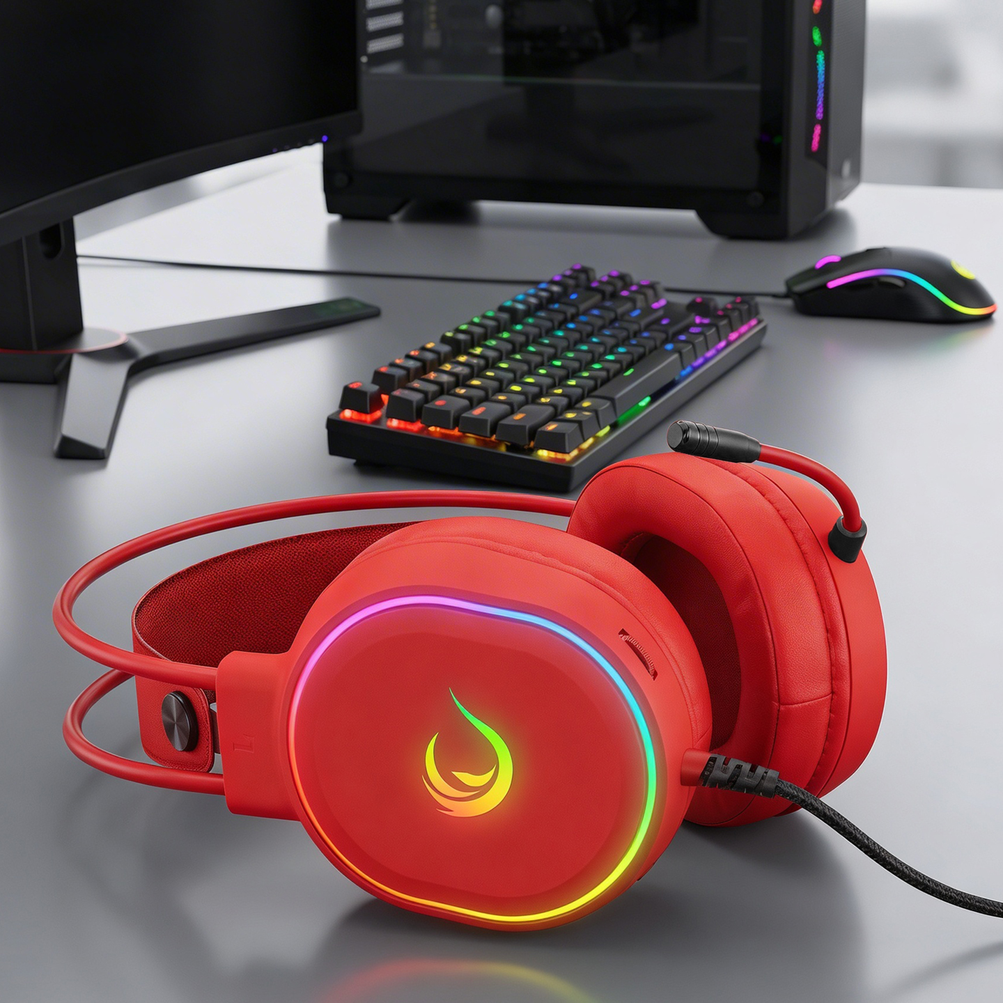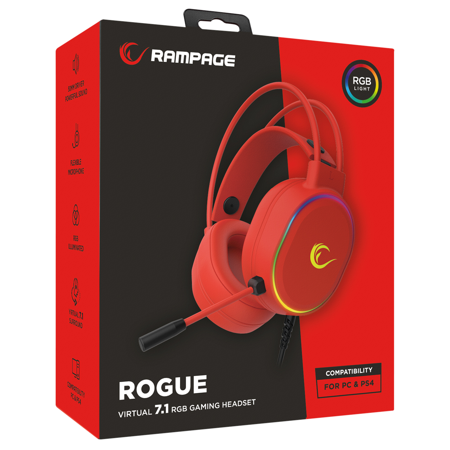 Rampage ROGUE RED USB RGB Led Gaming Headset with Long flexible Microphone. In Line Control