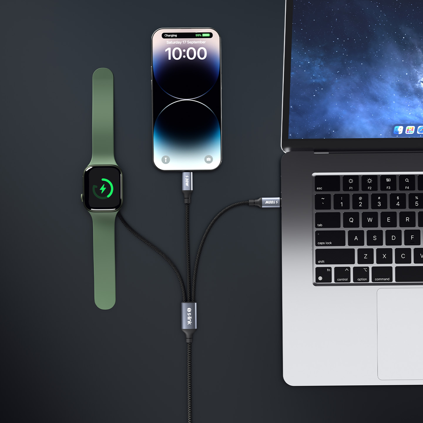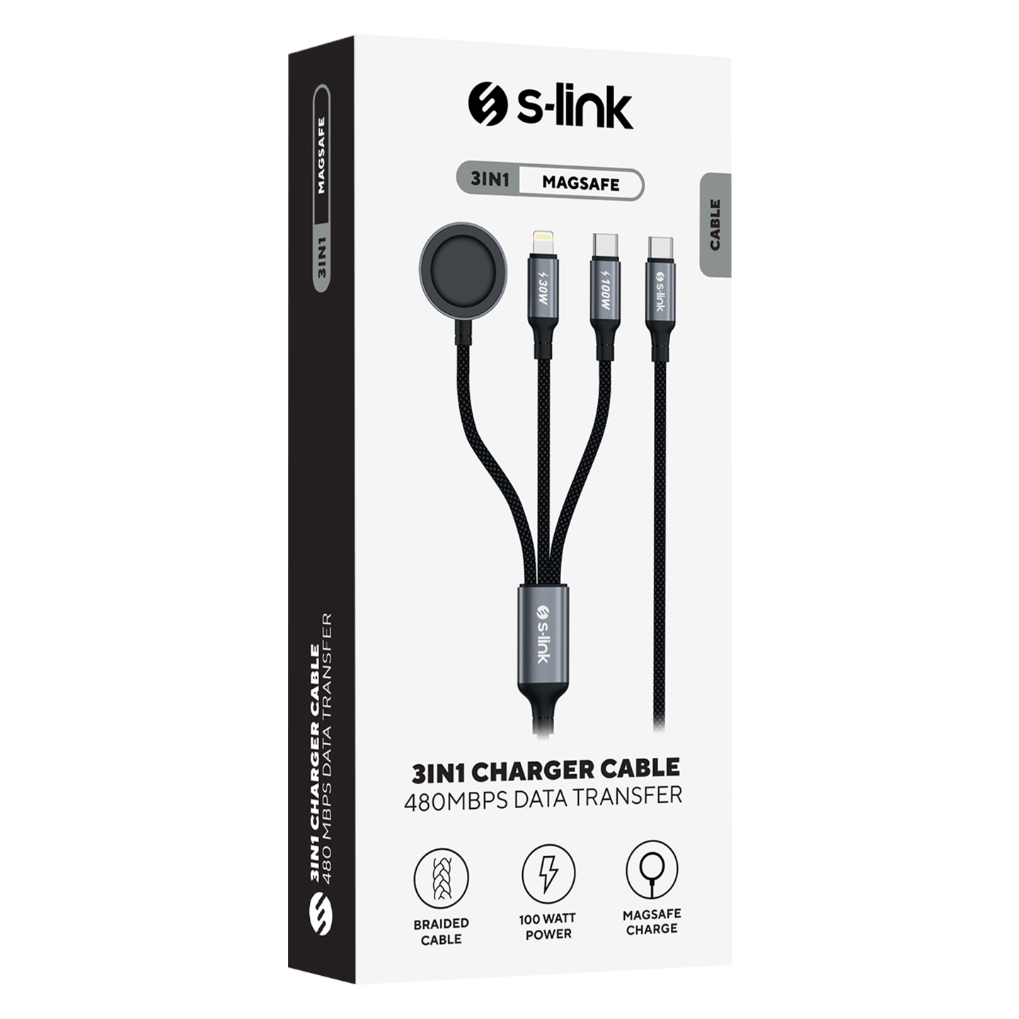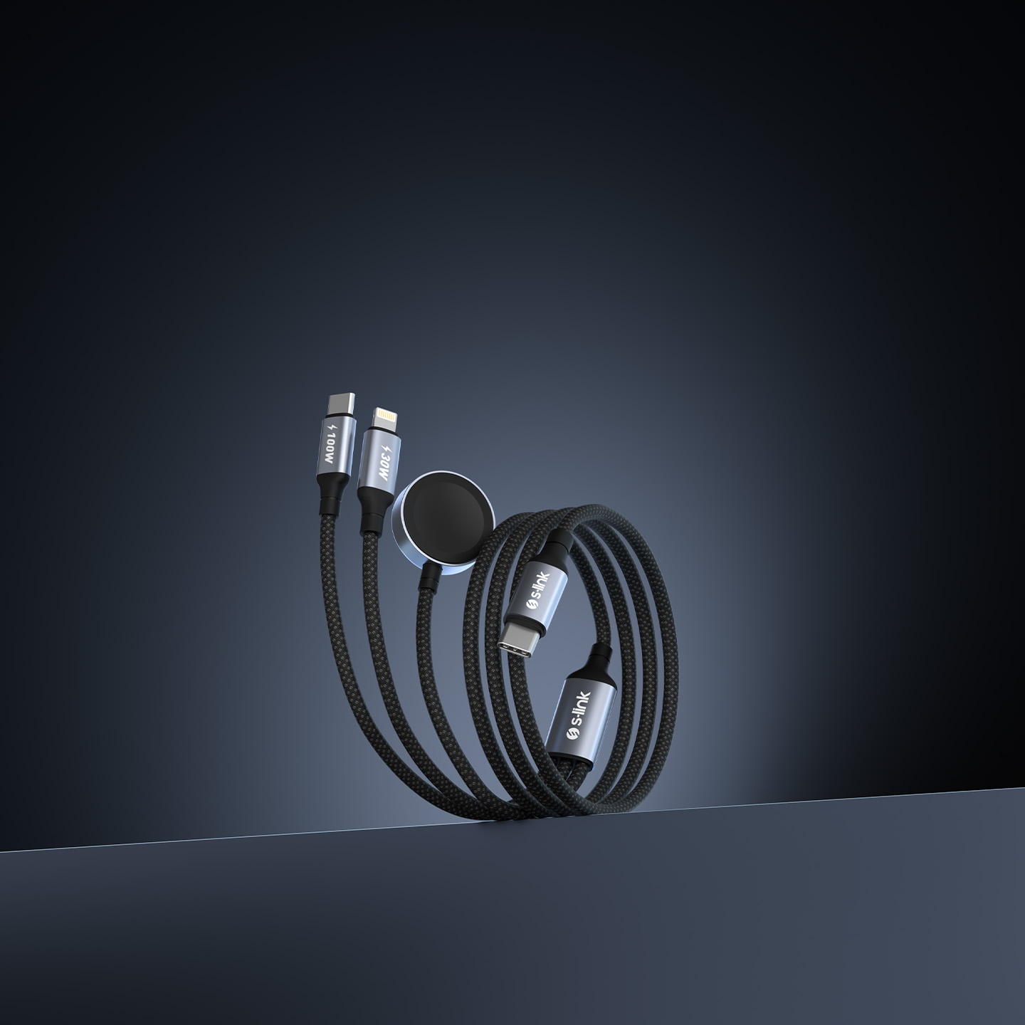 S-link Armor CLW-01 100W 1.2m Type-C to Type-C Lightning - Watch Metal Başlıklı 3in 1 Örgülü Siyah Hızlı Şarj Kablosu