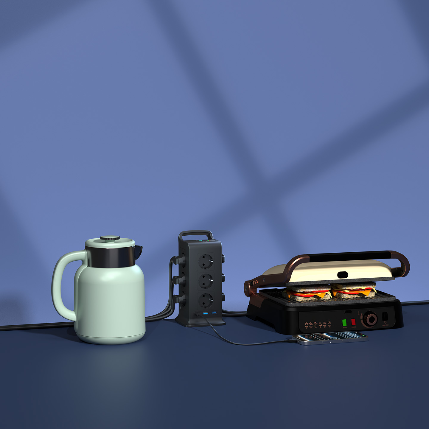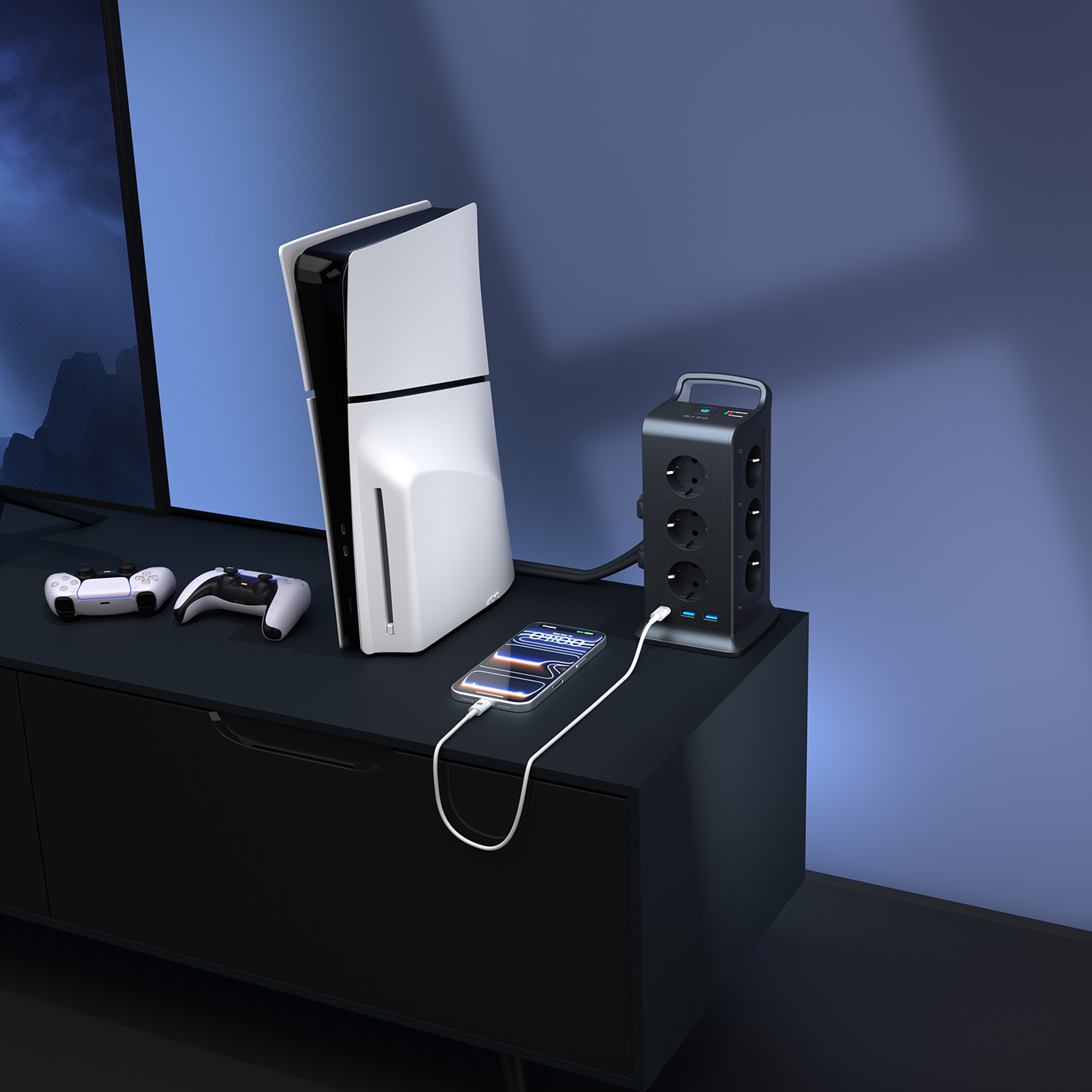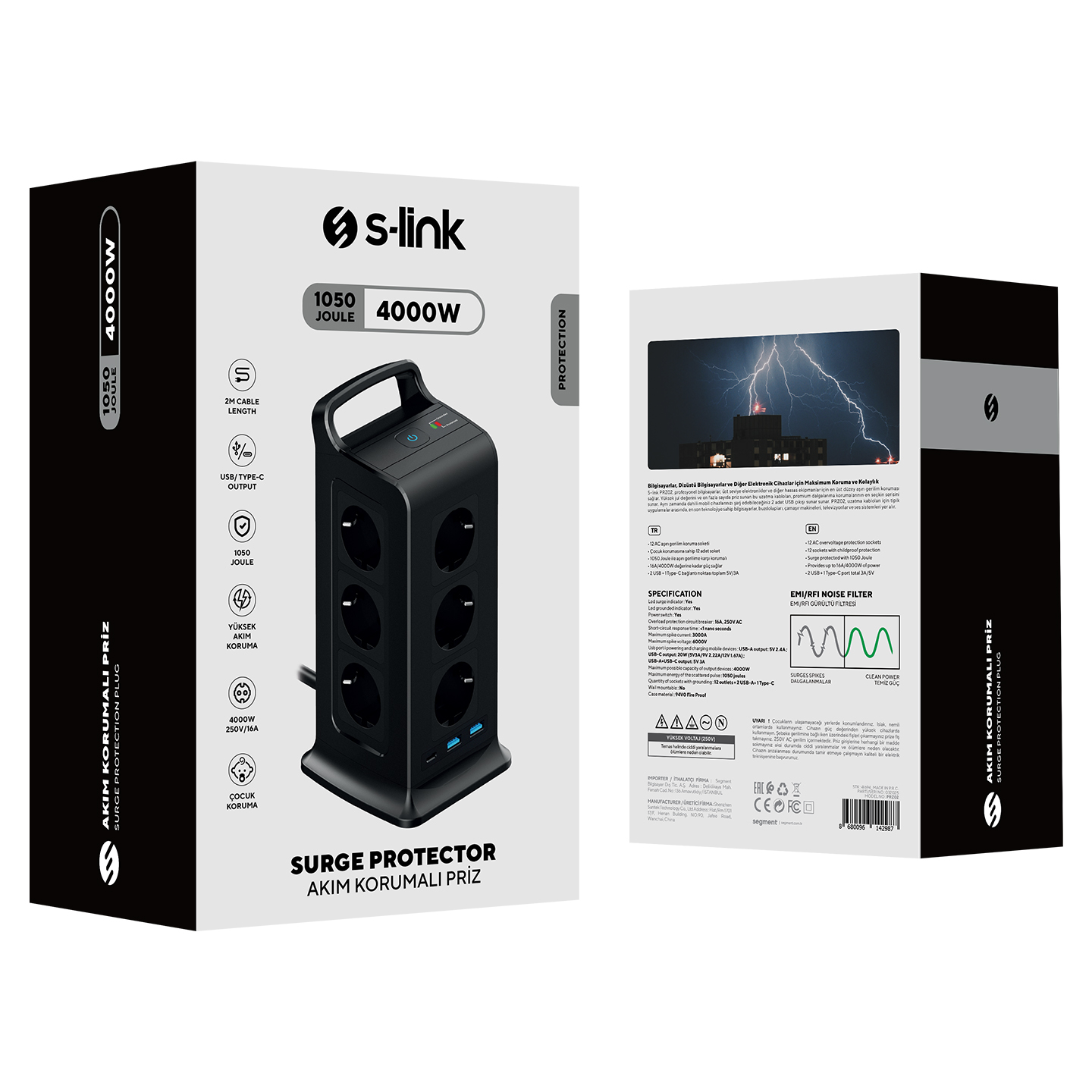 S-link PRZ02 VoltBar 12 Soketli 2*USB+TYPE-C PD Hızlı Şarjlı 2M 1050 Joule Tam Bakır Kablolu Kule Akım Koruma Grup Priz