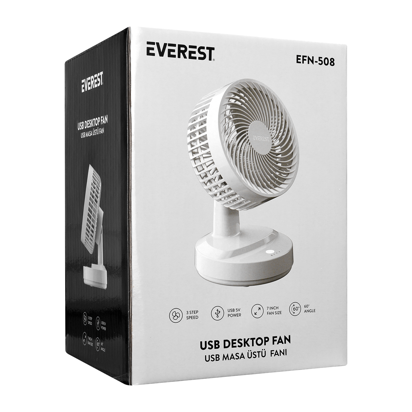 Everest EFN-508 Beyaz 7 İnç 3 Kademeli 2100 RPM Hız Masaüstü Usb Fan