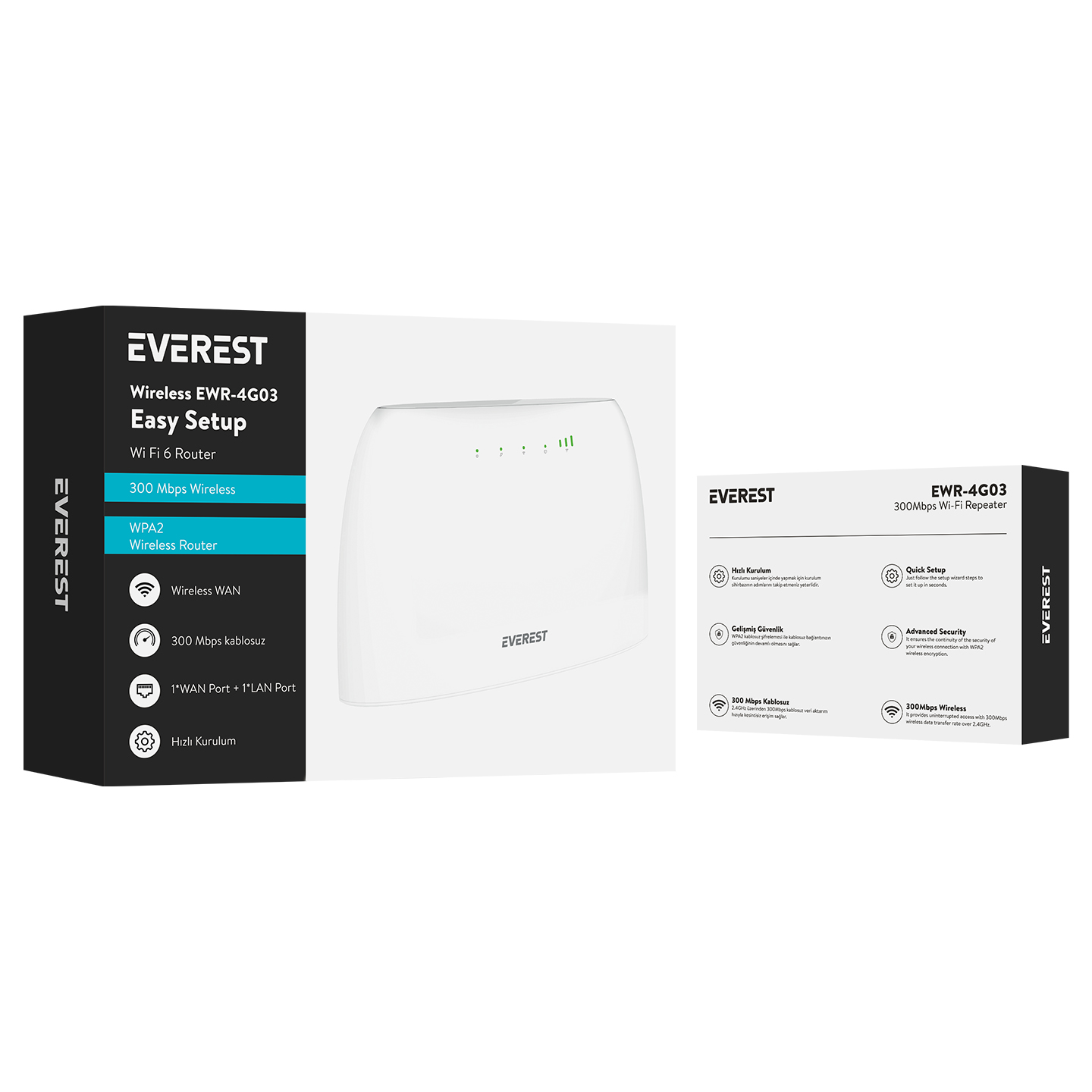 Everest EWR-4G03 300Mbps 2.4GHz Wifi 1xWan 1xLan 1xSIM Card 4G LTE Wireless Router ÜRÜN KODU 42553 BARKOD 8680096148712 Genel Bakış Teknik Özellikler Sürücüyü indirmek için TIKLAYIN