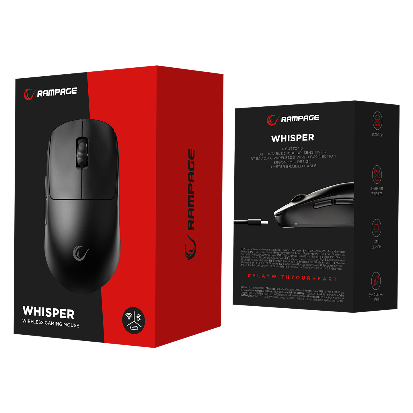 Rampage Whisper Kablosuz Siyah 24000 DPI 3311 Sensor Şarjlı 80 Million Huano Switch 39 Gram Gaming Oyuncu Mouse ÜRÜN KODU 42812 BARKOD 8680096150043 Genel Bakış Teknik Özellikler Sürücüyü indirmek için TIKLAYIN