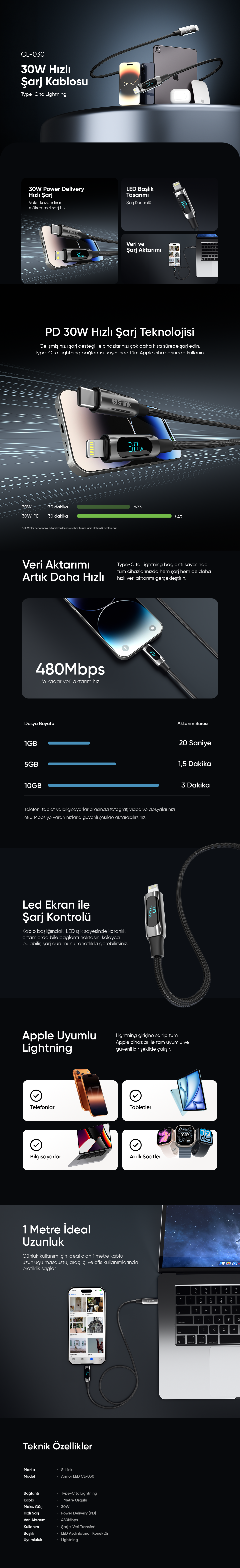 S-link Armor LED CL-030 30W 1m Type-C to Lightning PD Örgülü LED Başlıklı Siyah Hızlı Şarj Kablosu ÜRÜN KODU 41762 BARKOD 8680096143779 Genel Bakış Teknik Özellikler Sürücüyü indirmek için TIKLAYIN