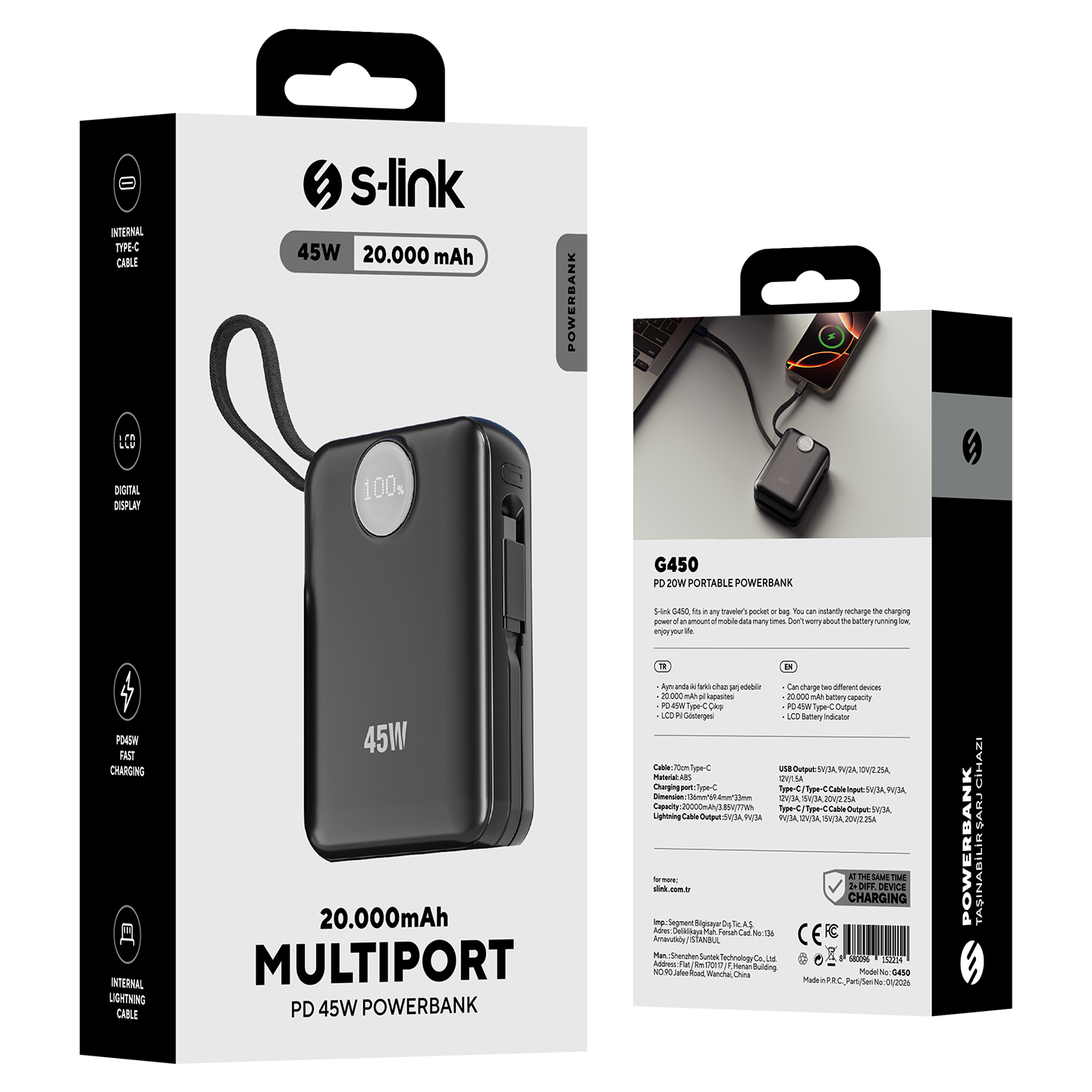 S-link G450 20000mAh PD45W+QC3.0 Dahili Kablolu Siyah LCD Taşınabilir Pil Şarj Cihazı Powerbank ÜRÜN KODU 43246 BARKOD 8680096152214 Genel Bakış Teknik Özellikler Sürücüyü indirmek için TIKLAYIN