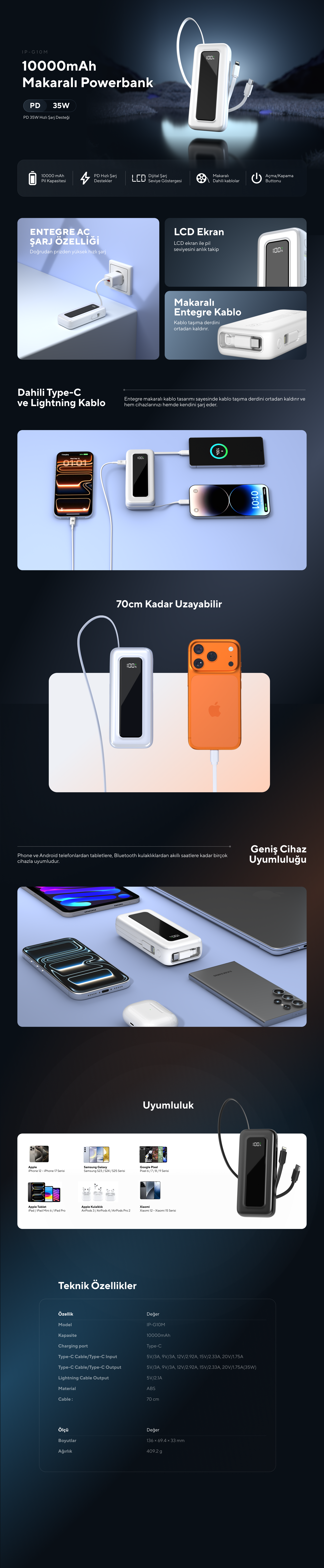 S-link IP-G10M 10000mAh PD35W Makaralı Beyaz LCD Taşınabilir Pil Şarj Cihazı Powerbank ÜRÜN KODU 42885 BARKOD 8680096150234 Genel Bakış Teknik Özellikler Sürücüyü indirmek için TIKLAYIN