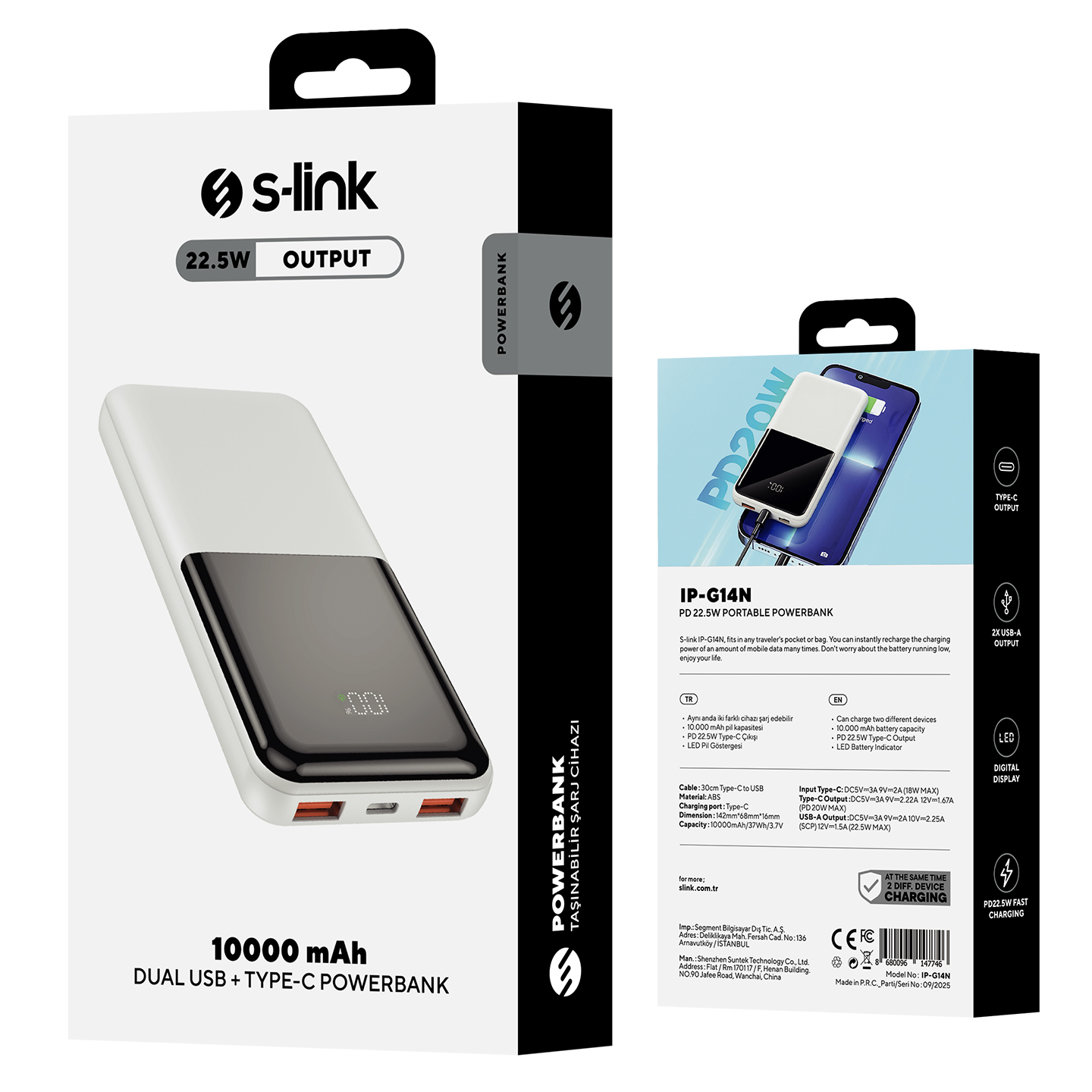 S-link IP-G14N 10000mAh PD20W Type-C Giriş+Çıkış Beyaz LCD Ekranlı Pil Şarj Cihazı Powerbank ÜRÜN KODU 42425 BARKOD 8680096147746 Genel Bakış Teknik Özellikler Sürücüyü indirmek için TIKLAYIN