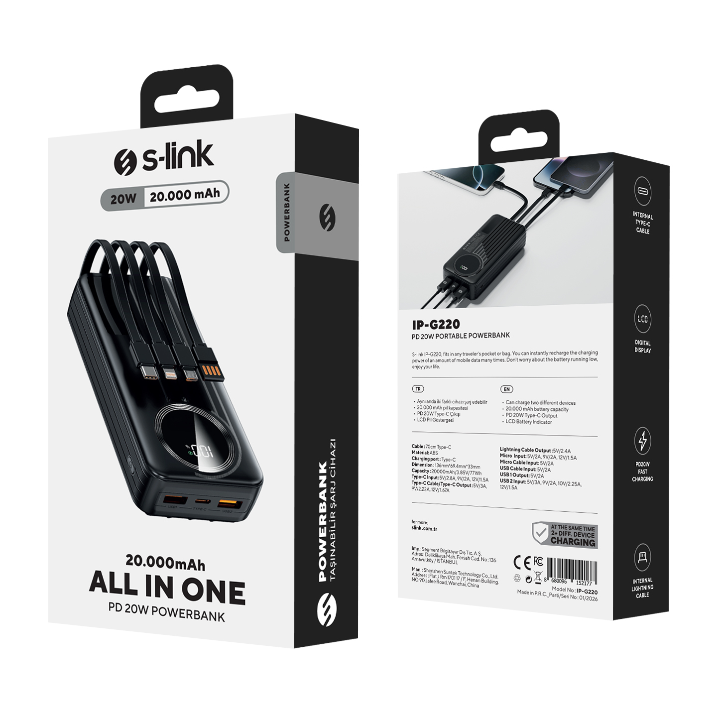 S-link IP-G220 20000mAh PD20W+QC3.0 Dahili Kablolu Siyah LCD Taşınabilir Pil Şarj Cihazı Powerbank ÜRÜN KODU 43242 BARKOD 8680096152177 Genel Bakış Teknik Özellikler Sürücüyü indirmek için TIKLAYIN