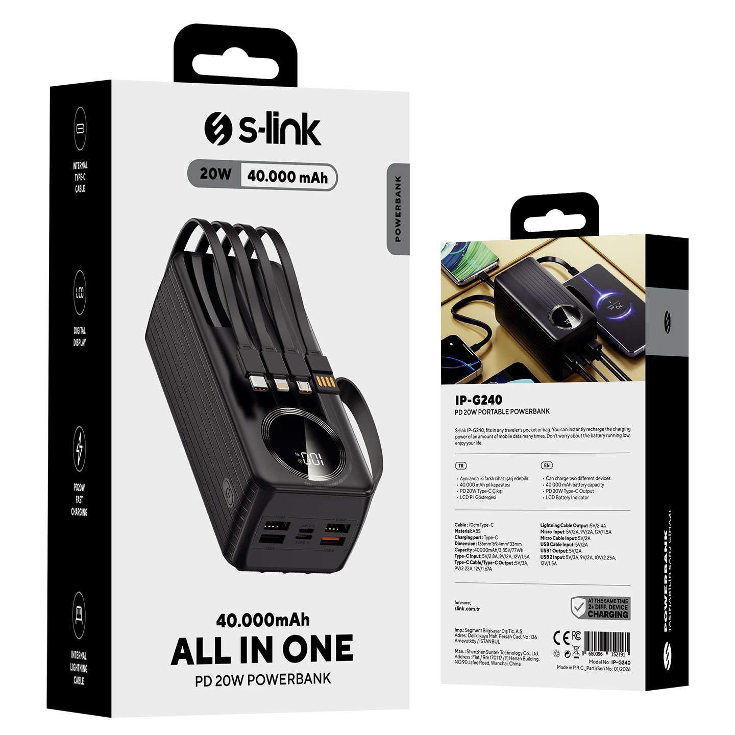 S-link IP-G240 40000mAh PD20W+QC3.0 Dahili Kablolu Siyah LCD Taşınabilir Pil Şarj Cihazı Powerbank ÜRÜN KODU 43244 BARKOD 8680096152191 Genel Bakış Teknik Özellikler Sürücüyü indirmek için TIKLAYIN