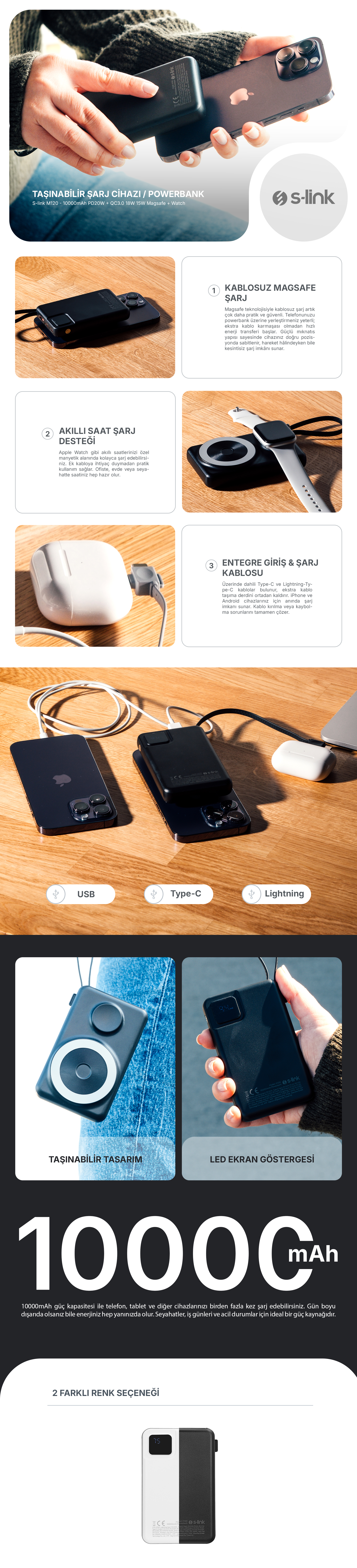 S-link M120 10000mAh PD20W + QC3.0 18W 15W Magsafe + Watch Siyah LCD Taşınabilir Pil Şarj Cihazı Powerbank