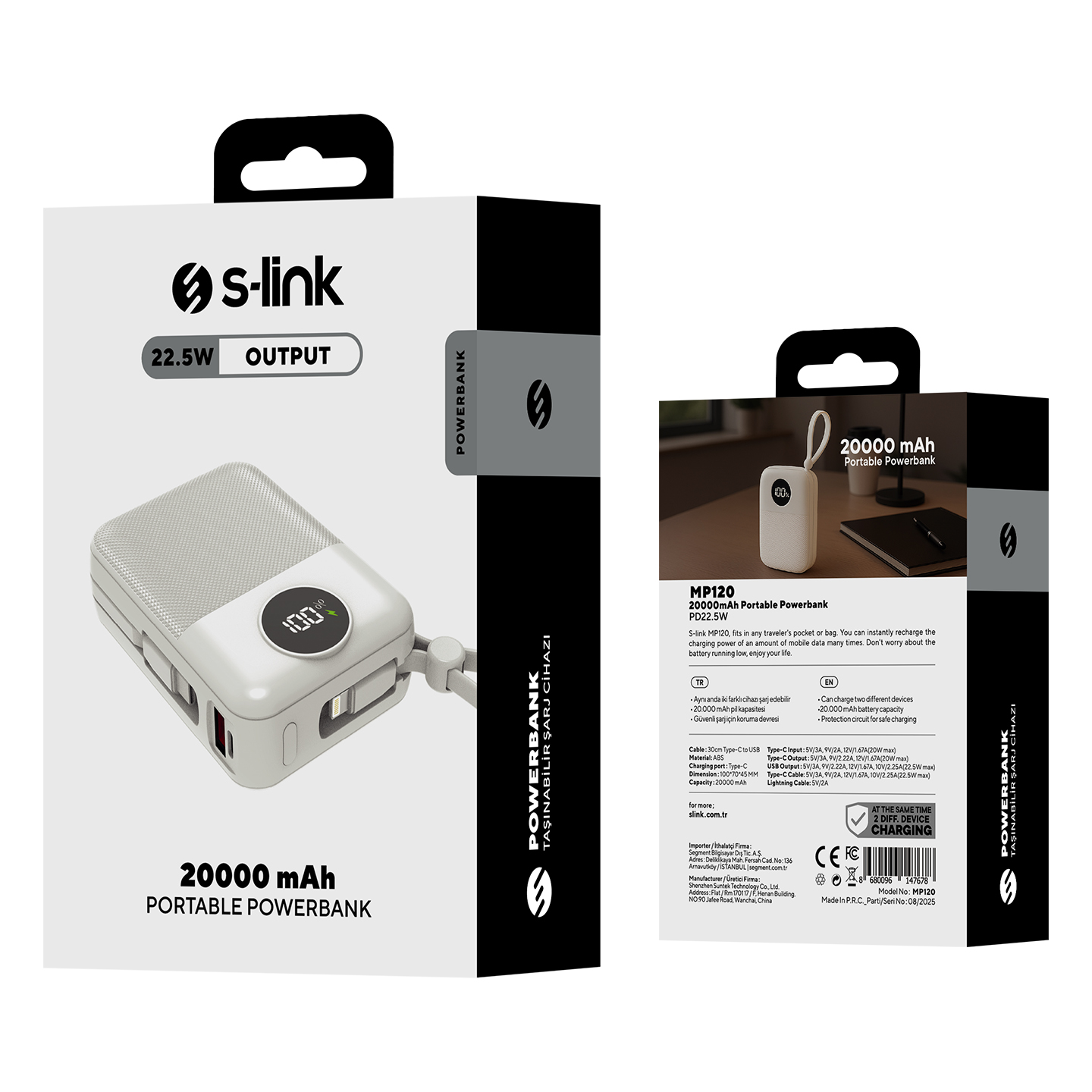 S-link MP120 20000mAh PD22.5W Type-C+Lightning Kablolu Beyaz LCD Taşınabilir Pil Şarj Cihazı Powerbank ÜRÜN KODU 42417 BARKOD 8680096147678 Genel Bakış Teknik Özellikler Sürücüyü indirmek için TIKLAYIN